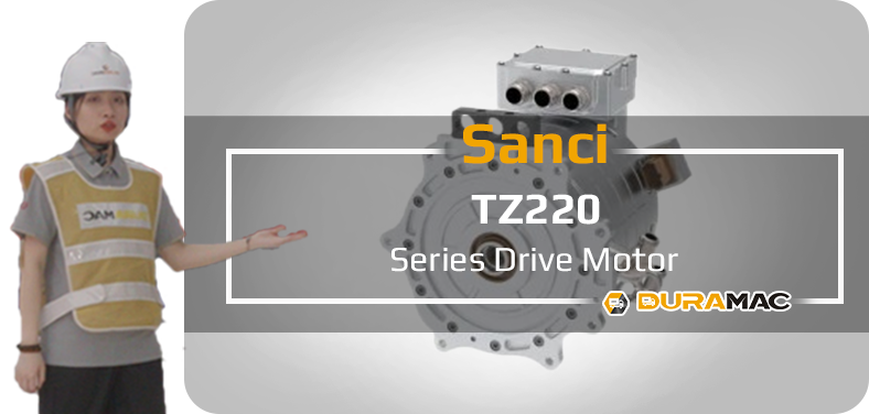 Sanci TZ220 series drive motor is a highly integrated electric drive system with a voltage platform of 350 VDC to 540 VDC, rated/peak power of 32.5/70 kW to 70/145 kW, and rated/peak torque of 140/320 Nm to 360/560 Nm.